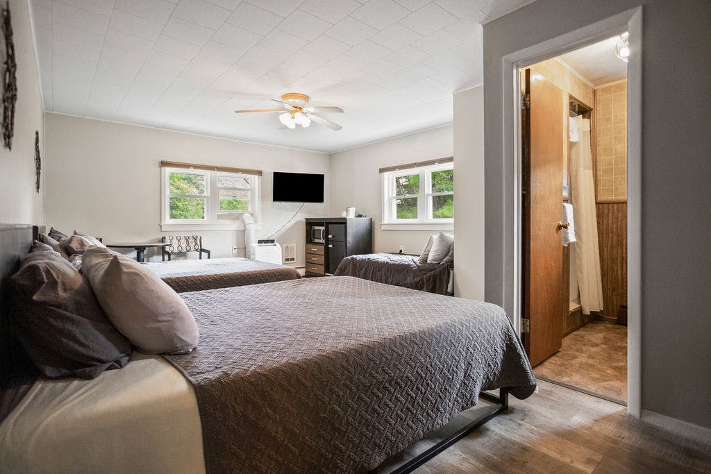 Step into a spacious retreat offering two queen beds and a twin bed, ensuring ample sleeping space for your group. Enjoy entertainment on the TV, and make use of the microwave and mini fridge. Your private bathroom comes stocked with essentials. Stay comfortable with air conditioning and heating while taking in mountain views. Basic hygiene items are provided for your convenience.