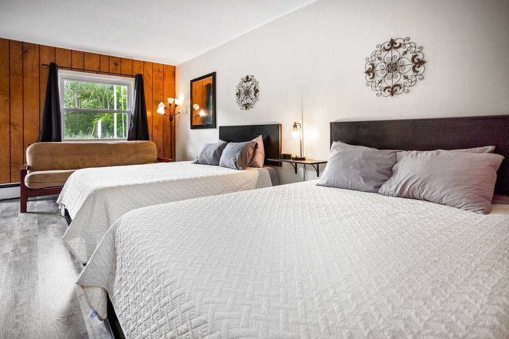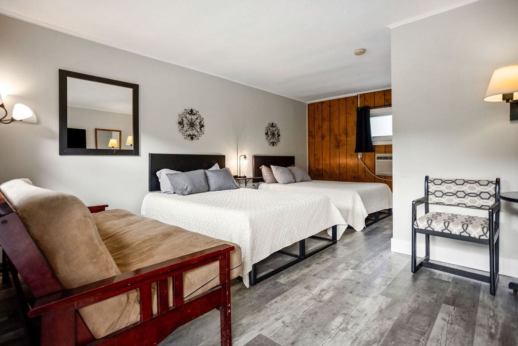 These rooms feature two double beds and a double futon. It also has a table with two chairs in addition to a microwave and mini fridge