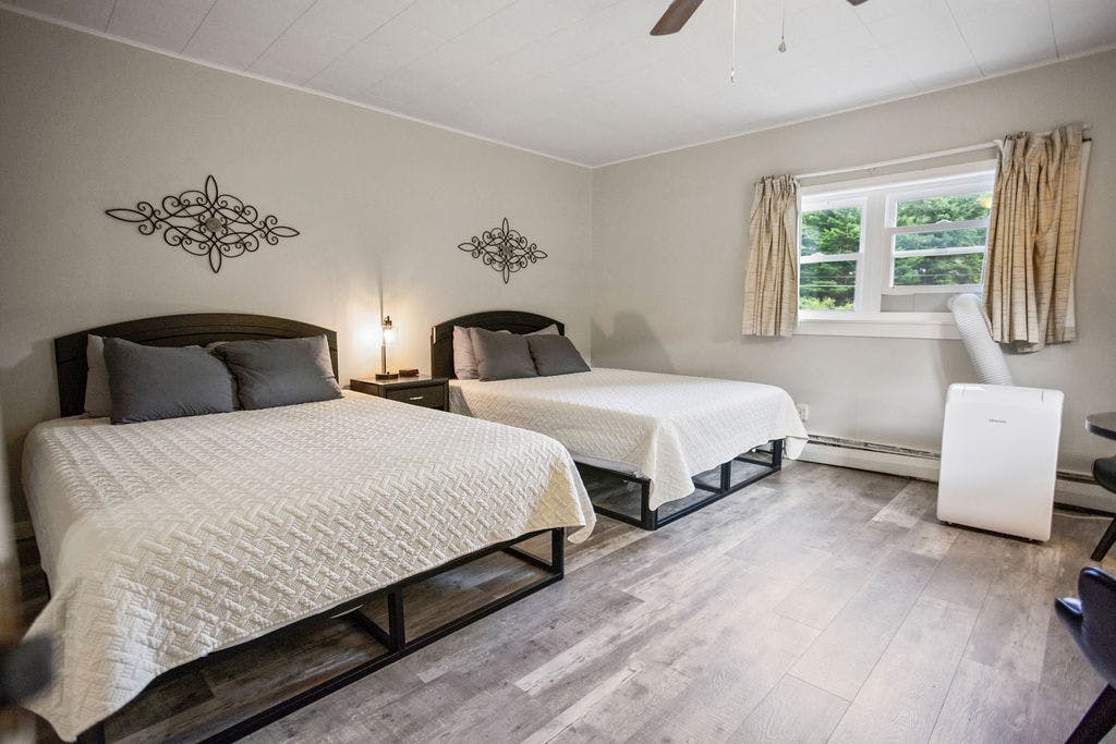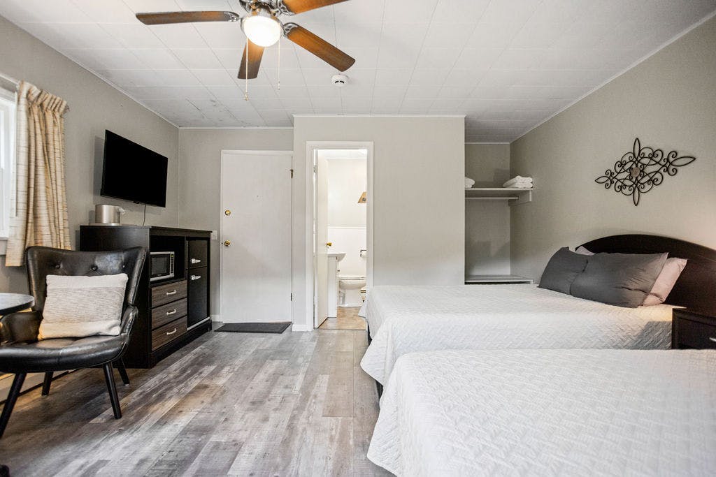 Welcome to our spacious and cozy room, where comfort meets convenience. Upon entering, you'll find yourself embraced by a welcoming ambiance. The room is adorned with two inviting queen beds, providing ample space for a peaceful night's rest. Sit back and relax in the comfort of the two chairs conveniently placed by a table, perfect for enjoying a snack or catching up on work.